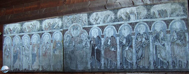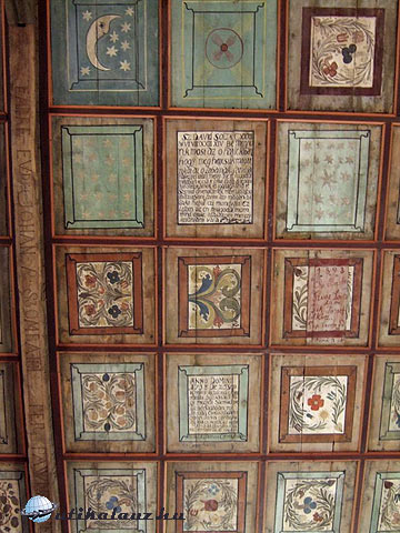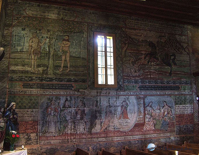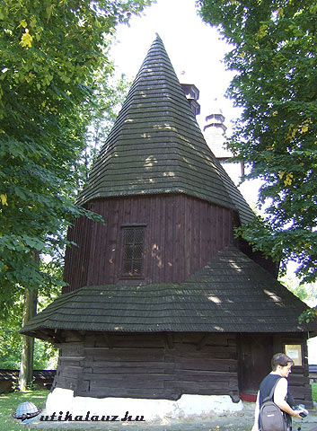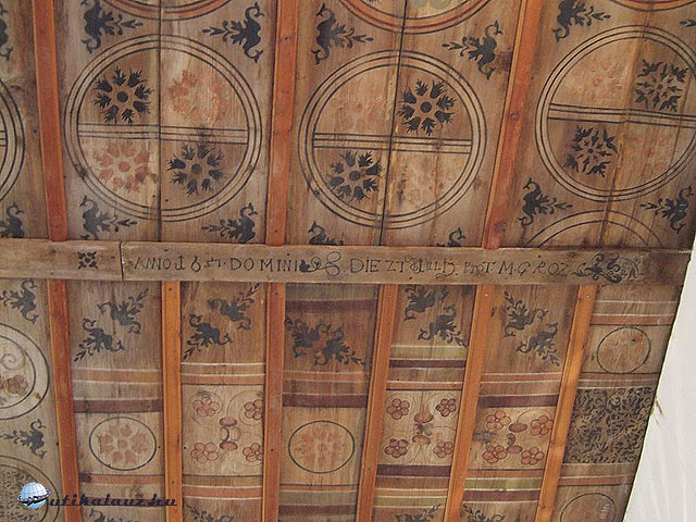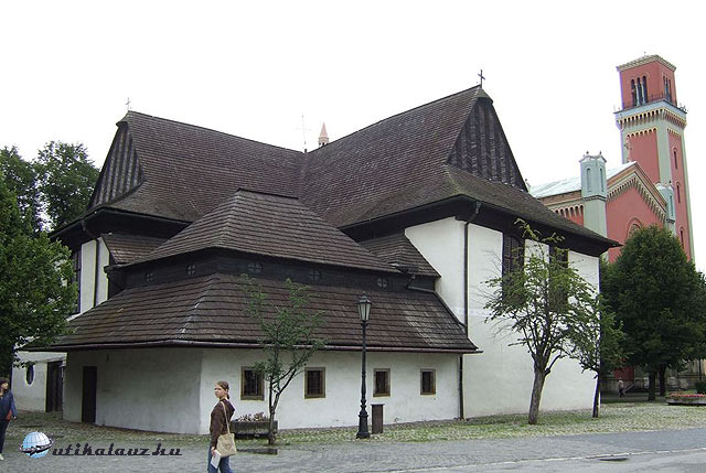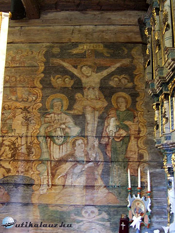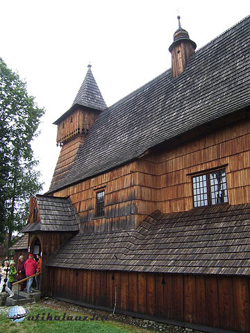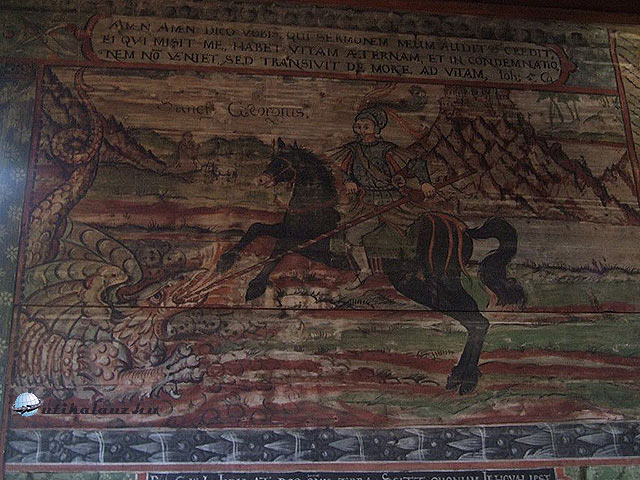 A templomkulcsot valóban abban a kb. 40 méterre lévő házban lakó néni őrzi, ami jelezve van a bejáratnál, és kedvesen meg is mutatja a templomot, a belépő sem volt drága. A római katolikus templom óriási élmény volt. A régi rendnek megfelelően fallal körülvett az 1593-ban (más forrás szerint a XV. században) tiszafából épült gótikus stílusú épület. Belülről szinte minden négyzetcentimétere festve van, egy része inkább csak textilborítást imitál, nagyobb része különböző korokból származó kép. Nekem a régebbiek tetszenek, a népies barokkok már nem igazán. Szent György és a sárkány, az Utolsó vacsora, a bűnbeesés, valamint egyéb bibliai történek olvashatók le a kis „képes bibliáról”. Nem véletlenül van rajta az UNESCO világörökség listáján! Mint utóbb kiderült, ez a fatemplom tetszett legjobban ezen a napon.