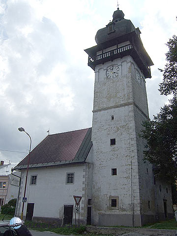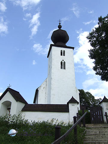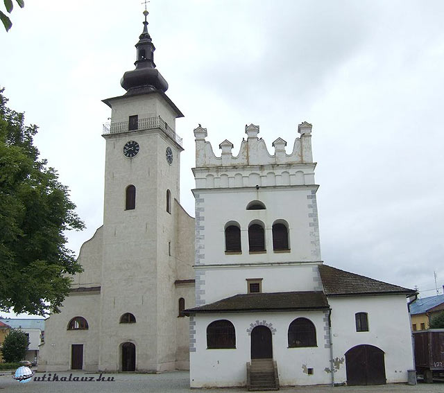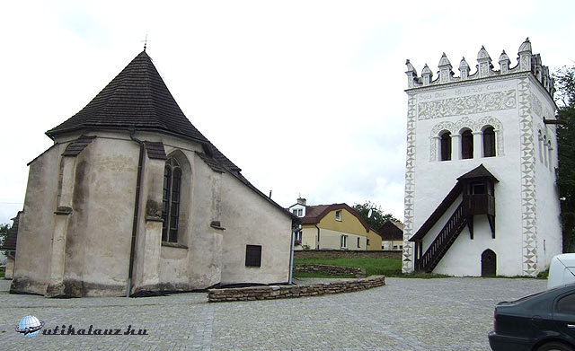 A nap utolsó megállója Podolin lett, ez az irodalmi ihletettségű hely. Főtere épp felújítás alatt állt, így jelentős területén fél méteres feltúrás volt – viszont jövőre már szép lesz. A tér közepén szokásosan a gótikus templom és a reneszánsz harangtorony áll. A XIII. századi templom igen sokat megőrzött eredeti jellegéből, belülről nem nagyon tudtunk szétnézni, mert épp mise kezdődött. Szentélye tele van középkori (XIV. sz.) freskókkal, azonban a sietség miatt nem sikerült szinte egyetlen kattintás sem. Oltára barokk, ez van… A harangtorony az errefelé szokásos reneszánsz stílusú, pártázatos tetődíszítéssel – szepességinek, lengyelnek is mondják az eredetileg Toszkánából jött stílust.