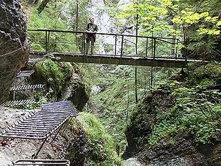 Először találkoztunk a sziklafalból kiálló rácsos vastálcákkal, melyeken egyensúlyozni kellett. Jobbról és balról sziklafal, alattunk a mélység és mindenhol csak a rohanó folyó moraja hallatszik. A fapallók csúsztak, helyenként egy-egy fok hiányzott, ami igencsak izgalmassá tette a kirándulást. Nagy kő esett le a szívemről, mikor megpillantottam az út végét. Az olyan utakra, melyeknél térkép jelöli, hogy vastálcák, létrák várhatók mindenképpen kell túrabakancsot vinni. Így utólag nem tűnik nehéznek, ha az ember tudja, hogy nem fordulhat vissza (sok az egyirányú út) és muszáj megcsinálni, akkor valahol eltűnik a tériszony és a félelem is, egy idő után átveszi a helyét a kaland érzése. Szerintem sokkal jobb, mint hegyeken-völgyeken át monoton gyalogolni. Kutyával lehetetlen végigcsinálni, és gyerekkel is csak akkor érdemes, ha nem ijedős és van már akkora, hogy a helyenként hiányzó fokokat át tudja lépni.