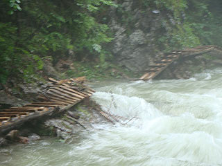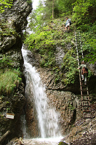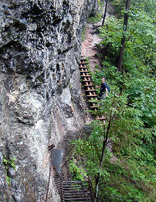 A Klastorisko chaty nevű helyen szenvedéseink rövid időre véget értek, ámbár utána más jellegű megpróbáltatások következtek. Itt található egy étterem (a fél literes kóla 400 Ft!), és van néhány chata is. Utunkat a kék jelzésen folytattuk. Néhány kilométer után észrevettem a térképen, hogy van egy kis sárgával jelölt leágazás, mely egy kanyar után visszatér oda, ahol éppen vagyunk. A térkép jelölte azt is, hogy itt végre vannak vastálcák, létrák és láncok is, gondoltam biztosan izgalmas, és csak egy órás kitérő, vágjunk hát bele. Így is lett. Aztán néhány száz méter után igencsak inamba szállt a bátorságom. Az út (csak az egyszerűség kedvéért nevezem útnak, különben nem az) két hatalmas sziklafal között egy szakadék fölött vezet, itt folyik (nem folyik, zuhog!) a Kysel nevű folyó. A szurdok így elsőre nagyon félelmetes volt, és én egyébként is félős vagyok.