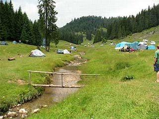 A réten a patak mindkét oldalán lehet sátrazni, mintegy 2-3 négyzetkilométer területen, úgyhogy nem kell egymás “nyakán” lenni. Patakcsobogás, hajnali ködpára, kora délutáni futó záporok biztosítottak :). Egymás sátraihoz, kocsikhoz szerintünk senki nem nyúl, de pénzt, fotógépet célszerű nappal magunkkal vinni. A jellemző társaság a komoly, természetszerető turista, bár néhány hangoskodó alak előfordul. Néha átvonul a helyi birkanyáj, vagy néhány legelésző paci bóklász a sátrak közt. Remek a levegő. Van pár mellékhelység céljaira épült bódé, de az emberek a környező fenyőerdőbe járnak…. nem probléma. Sajna a szemétszállítás nem megoldott; a kirakott 3-4 konténert az erdőgazdaság szezononként valószínűleg csak egyszer üríti (:, úgyhogy sok a tűzrakóhelyeken otthagyott palack, stb. Célszerű a sajátunkat elégetni, vagy magunkkal vinni le a hegyről.