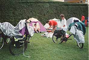 Bármelyik irányból megyünk, kellő időben mindig útba esik egy kemping, ahol még a legutoljára érkező biciklisnek is szorítanak helyet. Legtöbben sátrakat visznek magukkal – ahogy mi is tettük – de van aki csak egy leterített fóliára fekszik a szabad ég alatt hálózsákjában. Pedig itt nem ritka az eső. Miközben a Balaton mellett kiszáradt minden július végén, a Duna mellett egymást érték a hatalmas zivatarok. Szerencsére legtöbb éjszaka jött, így csak attól kellett tartanunk, hogy a szél vagy a víz sátorral együtt elvisz bennünket.