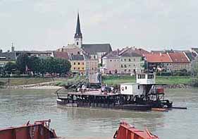 Hosszú gondolkodás után úgy határoztunk, hogy átmegyünk. talán jobb lett volna, ha maradunk – nem a lépcsőzés, hanem   túlsó part miatt – és az engelhartszelli komppal vagy a wesenuferi hídon megyünk át. De legjobban talán akkor tettünk volna, ha schlögeni kompig elbiciklizünk a bal parton, mert akkor kihagyjuk a jobboldalon lévő fárasztó és veszélyes közúti biciklizést. (S végül azt is megtehettük volna, hogy Passauból a jobb parton indulunk, majd az erőműnél átmegyünk a baloldalra, és Shclögenig ott maradunk. Nézzétek meg, melyik a jobb megoldás!)