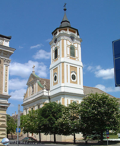 Sétánkat a főtéren kezdtük. A város méretéhez képest hatalmas, négyszöget formázó Szentháromság tér képét a barokk Grassalkovich-palotából száz éve neoreneszánsz stílusban kialakított Városháza határozza meg. A középső részén kétemeletessé magasodó épület a többi ház társaságában középkor végi hangulatot kölcsönöz a térnek.