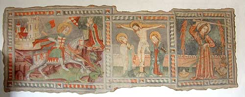 A szakértők szerint a templom építésével egy időben készültek a hajó északi falán és a diadalíven ma is látható freskók. Tehát azok a falképek, amelyeket még a nedves vakolatra festettek, s így a festék beleivódott a falba. A diadalíven és a szentély falán látható seccok, azaz száraz vakolatra készült képek száz évvel későbbiek.