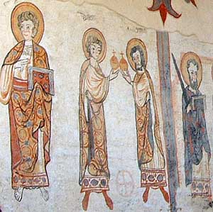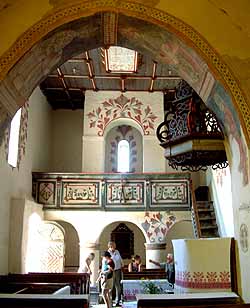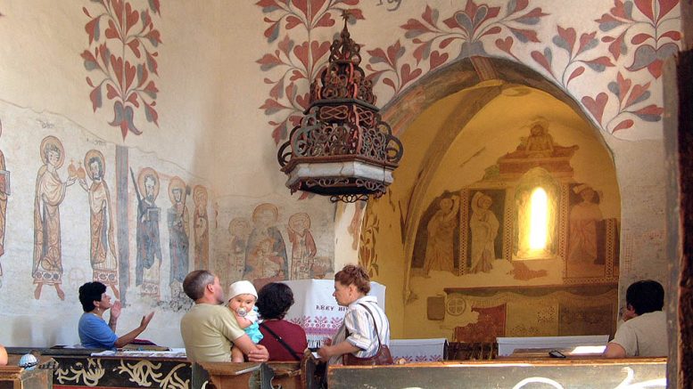 Az elmúlt évtizedekben a későbbi vakolat rétegek eltávolítása után a restaurátorok ismét láthatóvá tették a 800 éve készült belső freskókat. S ha magunktól nem jönnénk rá, mitől olyan furcsák, az itteni kalauz, Gál Miklósné, Piroska biztosan figyelmeztet bennünket, hogy a képeken látható szenteket, apostolokat a világon egyedül álló módon mosolygósan ábrázolta az egykori festő.