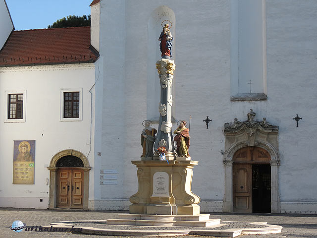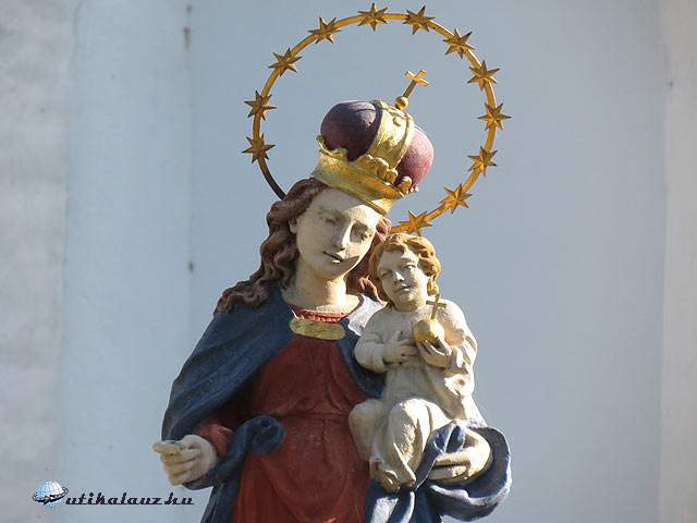 A templom előtt álló, 18. századi Szeplőtelen fogantatás szoborcsoport Szűz Máriát és szüleit, Szent Annát és Joachimot ábrázolja. A legenda szerint a Rákóczi szabadságharc idején egy katona Asszony, adj kenyeret! Felkiáltással fordult Mária szobrához, majd rálőtt annak karjára, ám a golyó visszapattant a lövőre. A szobrot uniós támogatással 2006-ban újították fel és állították vissza az eredeti helyére. Az akkor elhelyezett tábla szerint református volt a Máriára lövő kuruc katona. Ennyit a kuruc-labanc megbékélésről. 🙂