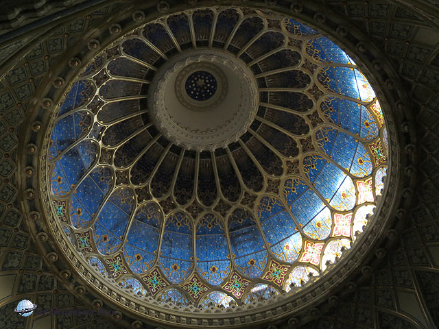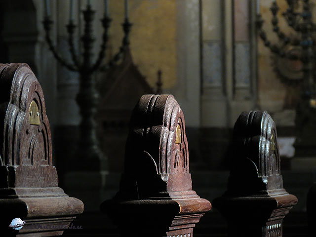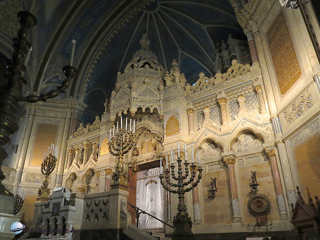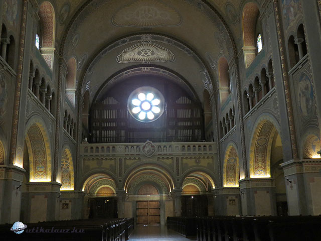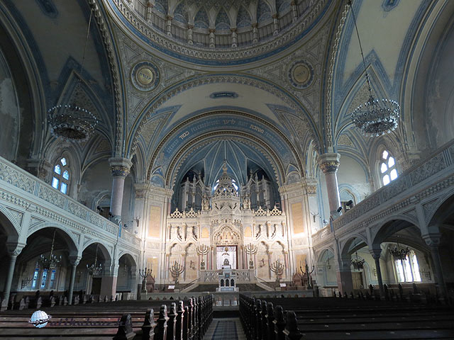 Bemenni nem tudtunk, mert erre csak előzetes egyeztetés alapján lenne mód. Az útikalauzok szerint a férfiaknak zsinagóga földszintjén 850 férőhelyet alakítottak, a nőknek pedig a galérián van 550 hely. Amikor építették a helyi izraeliták fele fért volna el egyszerre a templomban. A 776 négyzetméter alapterületű épület terveit is Komor Marcell és Jakab Dezső készítette. Az ablakokat Róth Miksa készítette. A zsinagóga kupolája 21 méteres magasságban indul, az átmérője itt 14 méter. Az épület legmagasabb pontja 40 méteres.