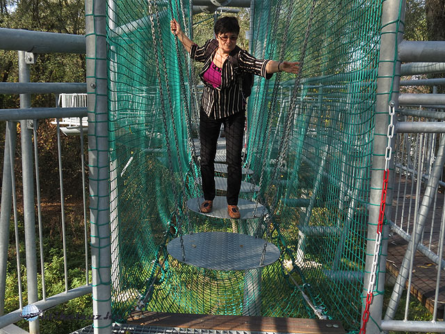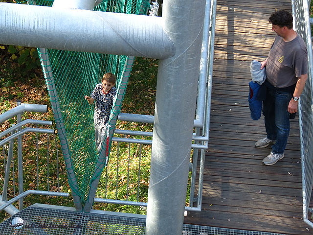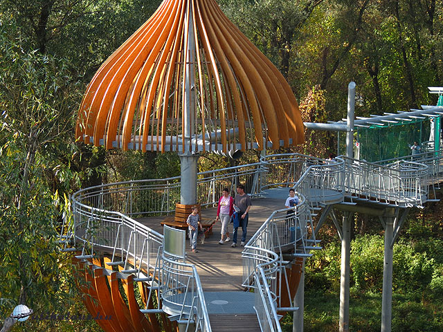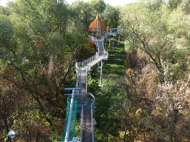 A föld fölött mintegy 10 méter magasan húzódó fémjárda közel kétszáz méter hosszú. Több ponton fényképes táblák mutatják be, hogy mit láthatunk, vagy éppen mit láthatnánk egy másik évszakban a növények, állatok közül. A lépcsők nagyon barátságos emelkedésűek, még a nehezebben járók is elindulhatnak rajtuk. Van néhány nehezített szakasz – hullámzó híd, erősen kilengő, láncokra erősített fémlapok, valamint egy hálóból készült átjáró -, de ezeket ki lehet kerülni. A hálónál mi is inkább ezt választottuk.