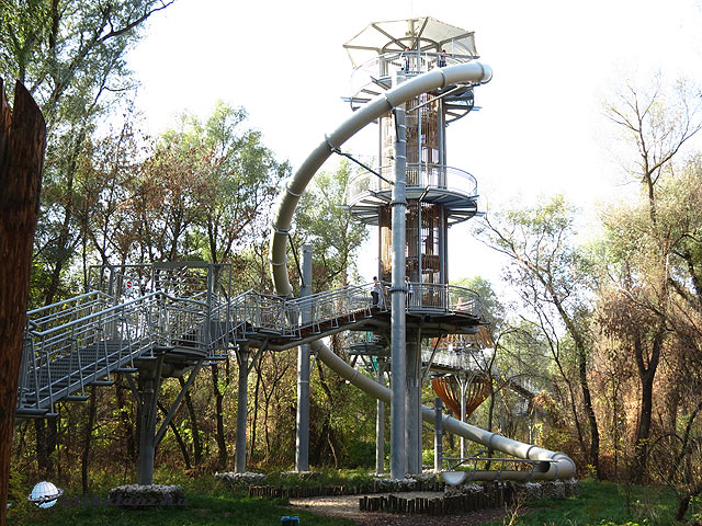 A kilátó felső szintjéről akár csúszva is lejöhetünk egy 61 méter hosszú csövön, valami speciális zsákot húzva magunkra. Szerencsére ez a szolgáltatás éppen nem működött, így nem okozott gondot a döntés. 🙂