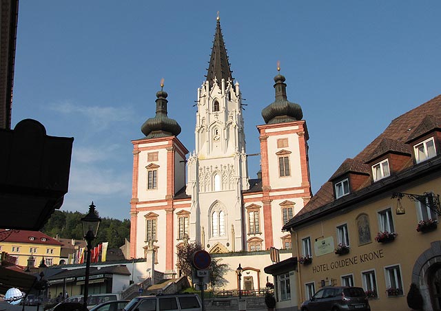 Máriacell a háromezer fő körüli lakosságával inkább egy nagy falunak mondható, de a központja olyan, mint egy valódi városé. Igaz, ez is alig két utcányi. A sétaút végéről érdekes látványt nyújtott, ahogy a központban álló templom tornyai és a nagyobb házak mögött nem újabb házak látszottak, hanem kisebb-nagyobb foltokban ott zöldült a Bürgeralpe oldala.