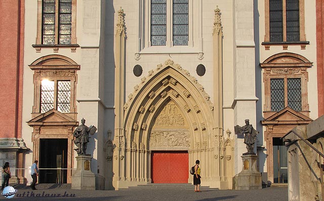 A gótikus kapu bal oldalán Nagy Lajos szobra őrködik