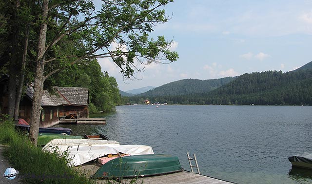 A tóhoz érve végigmentünk az észak-keleti parton. Először elhaladtunk egy parasztgazdaság mellett, ahol éppen hordták a szénát a pajtába. Aztán valami hotel, vagy nagyobb társasüdülő előtt gurultunk el, de utána már csendes, erdős területen haladtunk, csak néhány nagyon régi ház, meg egy félig vízre épült horgásztanya volt az út mellett. Többnyire közvetlenül a víz mellett vitt az út. Néhány helyen asztallal, padokkal pihenőhelyet alakítottak ki, ahonnan nagyon szép kilátás nyílt a tóra. Az egyik ilyennél volt valami felirat egy féltékeny molnárról, meg a feleségéről, aki végül vízbe ölte magát, és a hajától csillog olyan szépen az egyébként sötét víz. (Lehet, hogy a molnár volt a bűnös a vízbeölésben, de erre nem mernék megesküdni, a nekünk nagyon idegen német szöveg miatt.)