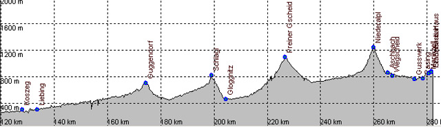 Még a nagyobb emelkedők előtt, Kirchschlag in der Buckligen Weltben tankoltunk. Az ár hasonló volt az itthonihoz. Igazán meg sem lepődtünk azon, hogy még itt, a határtól 30 kilométerre is magyar a benzinkutas, aki naponta ingázik a határ itthoni oldaláról.