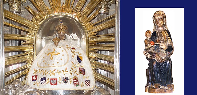 A csodatévő szobor felöltöztetve és eredeti formájában (Forrás a bazilika oldala – Gnadenstatue Bild-Nr.: G-01 és G-02 – forrás: www.basilika-mariazell.at – c. Franz Josef Rupprecht)