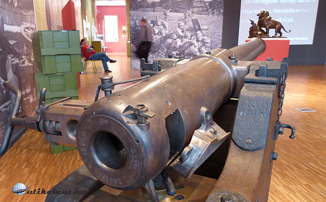 A szobor másolata az ágyú csöve előtt
