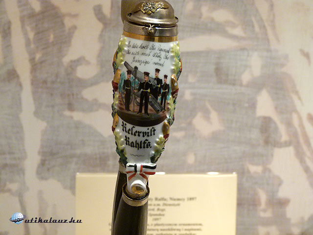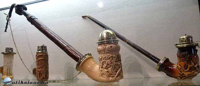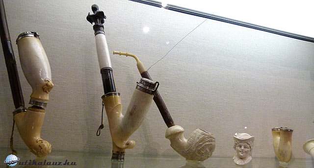 Az alsó szinten látható pipák anyagban és stílusban is rendkívül változatosak. Mondhatnám, természetes, hogy a díszítésben a katonaélet itt is meghatározó.