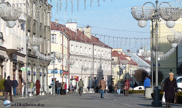 Rzeszów korzója, a Mágnások útja – jelenleg Május 3. utca. Előző este már végigmentünk az egykori Mágnások utcáján, amit ma az alkotmányuk 1791-es elfogadása kapcsán Május 3. utcának neveznek. Este is szép volt az adventi kivilágításban, és a napsütésben is nagyon kellemes helynek tűnt. A forgalom messze elmaradt attól, amit egy 160 ezer lakosú városban várna az ember, de ez inkább még tetszett is. A házak elsősorban a 19. században épülhettek, bár voltak régebbiek és jóval újabbak, köztük néhány nagyon szép szecessziós épület is.