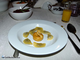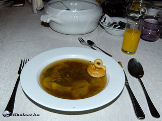 Karpati Trojaból a közelben lévő Jaslon át utaztunk tovább, ahol megálltunk ebédelni. Ahogy később is, mindig az országra és a szűkebb vidékre jellemző ételeket ettünk. Meghatározó volt a gomba, a káposzta, a cékla, a torma, ezek sokszor vegyítve. Itt például a levesbetét olyan volt, mintha barátfüle lenne, csak éppen lekvár helyett gombával töltötték. Ráadásként egy hattyú formájú tészta is úszott középen, hogy a látvány is meglegyen.