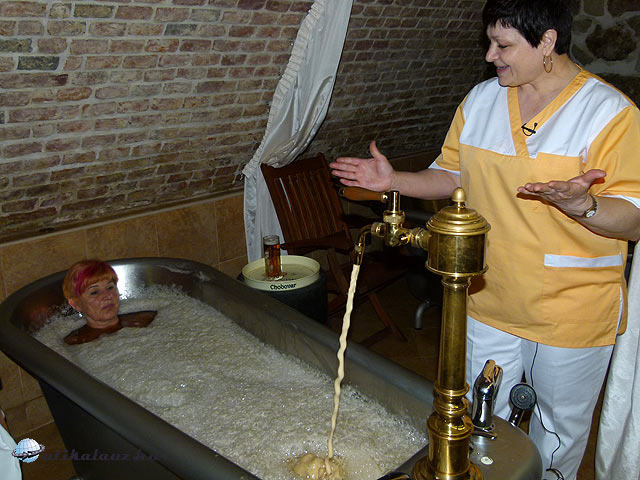 Kirándulásunk utolsó napjának fő érdekessége volt a Chodova Planában működő sörfürdő megnézése. Pontosabban az egyiké, mert több is van a települések. Az egy és kétszemélyes kádakkal működő fürdőt közvetlenül a Chodovar sörgyár mellett alakították ki. A “fürdővíznek” csak a kisebb része valódi sör, amit külön erre a célra különleges gyógynövénykeverékkel főznek, a többi helyi ásványvíz és hőfokot beállító tiszta forró víz 1:1 arányú keveréke. Sörből a kád méretétől függően 10 vagy 20 litert adnak a 34-36 fokos vízhez, és egy sörélesztőből, darált komlóból készített keveréket is tesznek bele. A sört külön erre a célra készítik, illetve – ha jól értettem -, nem csinálják vele végig teljesen azt a gyártási folyamatot, ami a palackozáshoz kell. Persze ettől még iható. Vannak olyanok is, akik nem elégszenek meg a fürdő mellé korsóban kapott sörrel, ezért a fürdőbe engedett sör egy részét is belsőleg használják.