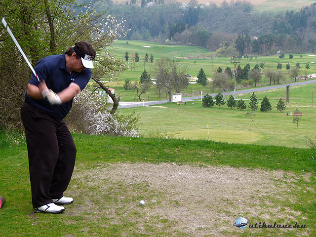 A kis sárga zászló mellett van a lyuk, amibe a labdát egy ütéssel be kellene ütni