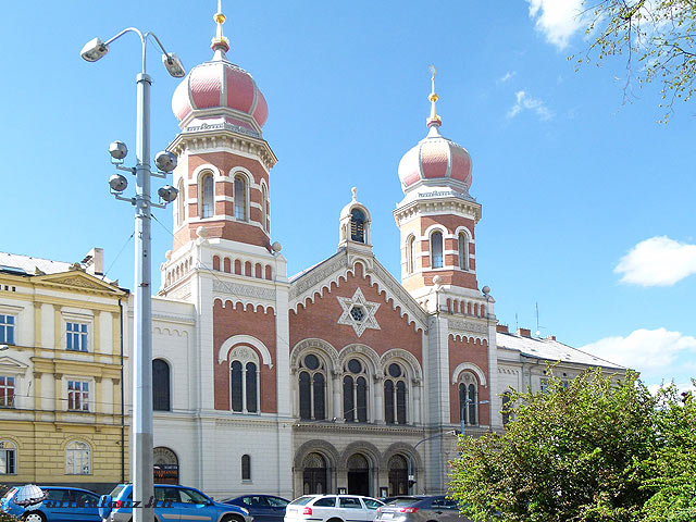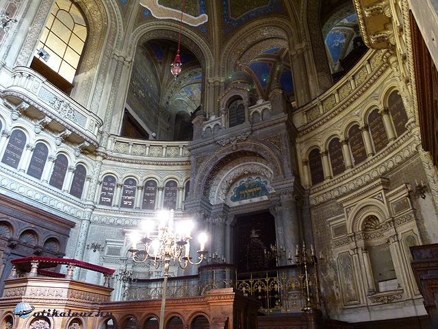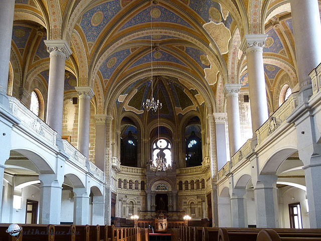 Az óváros nyugati szélén a “Nagyzsinagógát” néztük meg belülről is. A világon a harmadik, Európában a második legnagyobb – ha jól tudom, a Dohány utcai után. Eredetileg magasabbra, nyúlánkabbra tervezték, de úgy nagyon hasonlított volna a főtéri templomhoz, annak látványban a konkurenciája lehetett volna. A város így nem járult hozzá az építéshez, ezért újratervezték, és 1893-ban mór-román stílusban építették fel, de találni rajta neoreneszánsz jegyeket is. Nagyon szép a homlokzata és a belső tere is. Különlegesek a világos, szinte vidámnak mondható színekből kialakított ablakai. A templomot ma hangversenyteremként használják.
