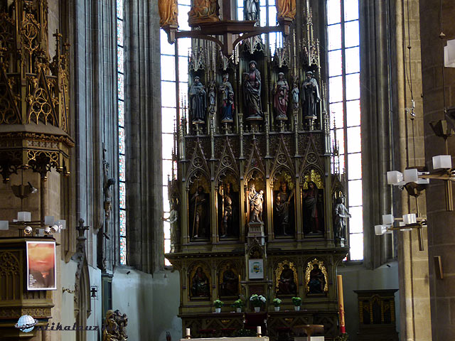 Csúcstartó a tér közepén álló Szent Bertalan templom is, aminek 102,6 méteres tornya a legmagasabb az országban. A gótikus stílusú építését 1297-ben kezdték, és éppen 200 évvel később fejezték be. A templom egyik nevezetessége a főoltárt díszítő madonna-szobor, az 1390-ben homokkőből faragott “Pilseni Madonna”. Amilyen szerencsém volt, éppen akkor sütött oda a nap egy kis fényfolttal rá, amikor ott jártunk. Így még inkább kiemelkedett környezetéből a szépségével.
