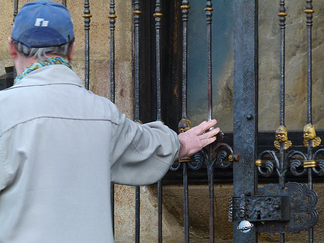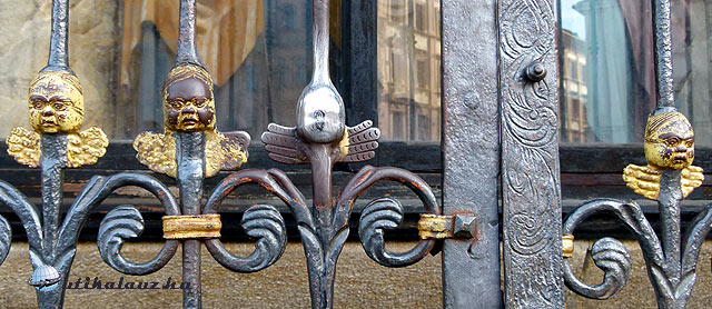 Másnap reggel ismét elsétáltam  a főtérre, hogy a reggeli fényekben is fotózni tudjak. Arra lettem figyelmes, hogy a téren áthaladók közül többen kis kitérőt tesznek a templom hátsó részénél lévő külső kápolna felé, ahol rövid időre megállnak. Közben mindegyikük megfogja a kovácsoltvas kerítést. Közelebb menve derült ki, hogy a gyors fohász alatt mindenki ugyanazt az angyalfej díszítést markolta. Legalábbis erre lehet következtetni, a mára felére fogyott, vonásait teljesen elvesztő kerítésdísz állapota alapján.