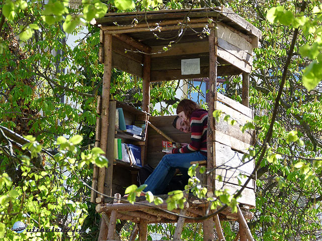 Könytári olvasóteremként működő vadászles a a Mestanska Beseda előtti parkban
