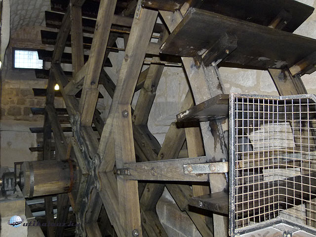 A föld alatti kirándulás igazán látványos része a végén volt, amikor a középkori víztorony hatalmas lapátkerekéhez értünk. A vízkerékkel hajtott szivattyú egykor az 1532-ben épült víztorony tetejére pumpálta fel a vizet, hogy a magasabban fekvő városrészekbe is eljuthasson.