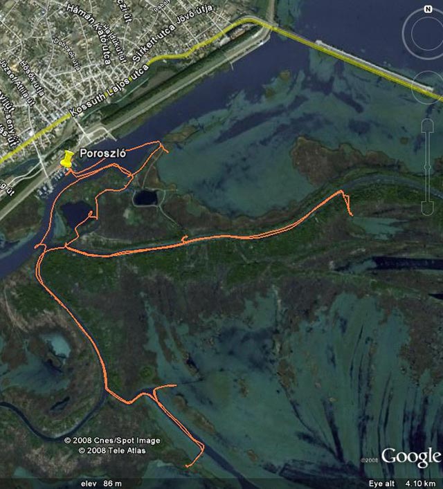 A Tisza-tó műholdas térképe – a narancssárga és piros vonalak a későbbi csónaktúráink GPS-szel rögzített útvonalai