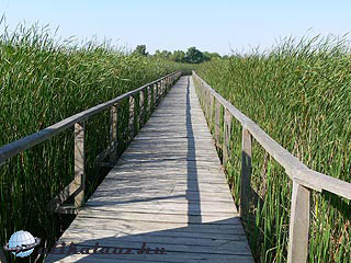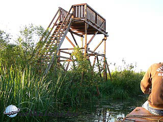 Túránk utolsó állomásaként kikötöttünk a vízisétány Poroszlóhoz közelebb eső végén, ahová a Delfin kikötőből közlekedő kishajóval Lászlóék napközben az utasokat szállítják. Innen a vízből kiálló cölöpökre épített deszkaösvényen lehet a két madárvártához és a panorámatoronyhoz sétálni. Az első nyitott oldalú házba be is mentünk.