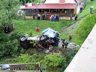 Délután úgy tűnt, elvonult az eső, ezért biciklire ültünk, hogy megnézzük a poroszlói tájházat. Sajnos most is csak a főúton kerékpározva mehettünk át Tiszafüredről Poroszlóra, ahogy tizenegy évvel ezelőtt is. Semmi nem változott. Rohanó teherautók, veszélyes helyzetben is előző személykocsik, sunyi gödrök, repedések, kitüremkedések az aszfaltban. (A jobboldali fotót a tiszafüredi tűzoltók készítették nem sokkal ott jártunk után kamionról, ami a Fehér Amur melleti hídnak áttörte a korlátját. A pótkocsi a Tiszába, a “traktor” a partra zuhant.)