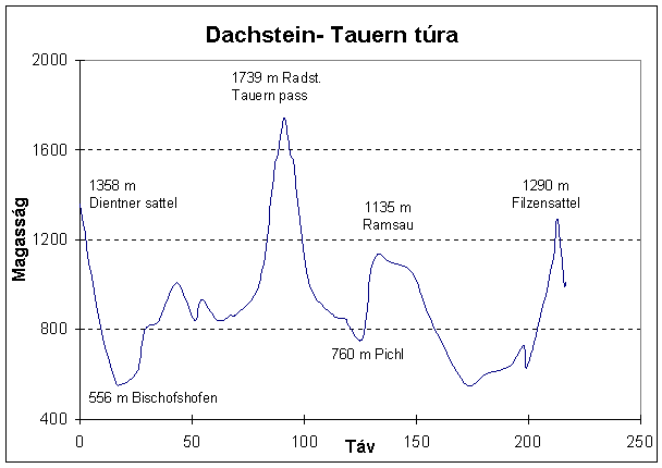 A diagnózis: Kiéheztem, akár Ullrich a Touron. Anyu éppen a meleg vacsorát tette fel melegedni, így időben szóltam, hogy dupla adag tésztát kérek. A szemem nagyobb volt, mint a szám, így a tészta harmada megmaradt. Bőséges ivás és pár alma után már sokkal jobb közérzettel és tervekkel a fejemben készülődtem másnapra. Az időjósok szerencsére napos időt ígértek. Mivel öt napunk volt még hátra a nyaralásból, én pedig még három túrát szerettem volna, a következő napra is jutott egy. Bár a másnapi szép idő miatt apu a Grossglocknerutat ajánlotta, én – egy ilyen kiéhezés után – nem láttam célszerűnek a legnagyobb erőpróbába belevágni. Mivel anyuék is éppen Radstadtba és a Dachstein fala alá tartottak, én is úgy döntöttem: azon a túrán indulok el. A három egész napos túra közül, 220 km-ével és 2800 m szintemelkedésével ez számított a második legnehezebbnek. Mivel terv szerint az útvonal a 15 %-os hágó felé indul, megkértem aput: kocsival vigyen fel a második hágó tetejéig. Ott már – megérkezésünk estéjén – úgyis jártam; hadd kezdjem inkább hosszú gurulással a túrát.