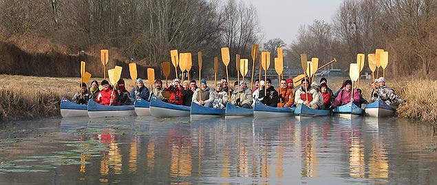 A csapat minden tagját az indulás pillanatában láttam először, mert önszerveződéssel jöttek össze M. János vezetésével. Ők rendszeresen járnak együtt evezni, kirándulni, így a hajóleosztást is rábíztam M. Jánosra. Vidáman indultunk útnak szombaton reggel Hévízről lefelé. Délben legalább plusz tíz fok volt, és olvadt mindenütt.