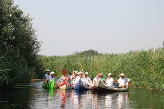 Újabb nap virradt ránk, immár az ötödik. Nem mondhatom, hogy a szokásos bepakolás következett, mert csomagolás közben megpróbáltunk minél kevesebb homokot magunkkal vinni – kevés sikerrel. Még a fogunk alatt is csikorgott reggelizés közben, de ez már ismerős volt korábbi dunai és tiszai túráinkról. Felpakolás után megkerültük a folyóba benyúló kősarkantyút és beeveztünk a Gemenci-erdő legnagyobb holt-ágába a Rezéti Holt-Dunába. Az előző este a táborhelyen váratlanul megjelenő nemzeti parki őr – aki elsősorban a szemeteszsák meglétére volt kíváncsi – említette, hogy utolsó pillanatban érkeztünk, mert néhány nap múlva a Rezéti-Dunában olyan kicsi lesz a víz, hogy nem lehet átmenni rajta. Hát ha ennyire kicsi még nem is volt, de a Senki-szigete előtti szakaszon többször ki kellett szállnunk a hajóból és vontatni a homokzátonyok felett. Az első kilométerek után azonban már jó vizünk volt végig, bár az evezés egy kicsit csalódás volt a Vajas-fokhoz képest. A víz időnként meglehetősen rossz minőségű volt, így csak egyszer tudtunk “csobbani”, bár a part ott is nagyon iszapos volt. Cserébe rengeteg madarat láttunk, nagy- és kiskócsagot, szürke-, vörös- és törpegémet, sast és barnakányát. Az elöl evezők őzekkel, vaddisznóval és fürdő szarvas csapattal is találkoztak. Sodrás szinte alig volt, így a 16 km-t végig eveztük. A déli torkolat közelében elsősorban a számtalan varsát kellett kerülgetni, de itt láttuk a legtöbb madarat is. A betorkollás után a szemközti parton találtunk egy jó kis zátonyt, ahol úszhattunk egyet, és megebédelhettünk – igaz, a már megszokott (vagy megszokhatatlan) szúnyog körítéssel. A továbbiakban már könnyű dolgunk volt, mert a haladásban a Duna is segített. Le is értünk hamar a bajai hídig, ami előtt a jobb parti strandon (Baja-Dunafürdőnél) kikötöttünk még egy kis fürdésre, majd a híd alatt áthaladva a Türr István emlékműnél befordultunk a Sugovicába. Jó néhányszor megálltunk megtudakolni a Czoboly Zoltán Vízicserkész Telep helyét, de nem sok sikerrel. Végül a Petőfi-szigeti kempingben a vízirendőrök igazítottak útba. A sziget déli végén, a hajójavítóval szemben egy nagy de kissé roggyant pontonnál és egy széles beton csónak-kiemelőnél álltunk meg. El se tévedhettünk volna, mert a parton már vártak ránk az újonnan érkezettek, akik itt csatlakoztak a túrához. A tábor gondnokával gyorsan megnéztem, hogy hova is jöttünk. Az első csónakot még hagyományosan kipakoltuk, és a hajót kézben felvittük, de a többi kiemeléséhez szereztünk egy kissé(!) rozoga csónak kocsit, aminek a segítségével pár perc alatt fenn volt az összes hajó cuccostul. A sátrakat a telep erdős részén, a fák alatt verhettük fel, de rendelkezésünkre állt egy nyitott fészer asztalokkal és padokkal, a végében fedett kétbográcsos tüzelőhellyel. Volt melegvizes zuhanyozó is és elfogadható WC hideg-melegvizes mosdóval. Persze a bojler elég hamar kiürült. Előkelő módon a vacsorához szükséges italmennyiséget telefonon rendelhettük meg és a helyszínre szállíttattuk. Alig hogy elkészült a tábor, és még félig kész volt a bográcsban a vacsorára szánt tutajos, ami annak ellenére elkészült, hogy nem engedtem lejjebb 20 centivel a bográcsot, ahogy ezt a gondnok javasolta, leszakadt az ég. Hatalmas eső és viharos szél keveredett, ami a fészer alatt is annyira bevert, hogy esőkabátban ültünk az asztalnál. Tituszék ebben az időben érkeztek, és verték fel – közös segítséggel – a sátrukat. Szerencsére a tábor vezetője másnap megengedte, hogy bevonuljunk a táborban álló komoly méretű csónakházba először csak ebédelni, később már lakókat is kapott az épület, mert a szűnni nem akaró zápor néhány sátrat lakhatatlanná tett. Természetesen evezésről másnap szó sem lehetett, a reggeli után bajai sétára indultunk, ami a Türr István Múzeumban torkollott. Alaposan megnéztük – egy nagyon kedves vezető kíséretével – a kiállítását, majd szabad program jegyében ki-ki ott ázott tovább, ahol akart. Néhányunk a közeli vendéglő nagyon kellemes konyhájával vigasztalódott. Estére – a rossz idő ellenére – újabb csapat érkezett, így a hagyományos bolognai spagetti-vacsorát már 29 főre főztem. Természetesen ezt is a csónakházban ettük meg, ami az egyre több bennlakótól és a száradni kiteregetett holmiktól kezdett Gorkij “Éjjeli menedékhelyére” hasonlítani. (Csak az “éjjeli” hiányzott, mert Feri, az ügyeletes cserkész állandóan kulcsra zárta az épületet, a kulcsot meg eltette. Így a bennlakók éjszak nem tudtak kijárni, pedig a sörözés-borozás után kellett volna…) A hazautazás előtti nap még mindig esett, akkor már több mint 35 órája, de becsületére legyen mondva mindenki kitartott legalábbis az esti halászléig. Délelőtt a sofőröket a vendég kocsik felvitték az autókért Kalocsára (ahol a Kalocsa Szálló igazgatója Márkus Kata látta vendégül egy kávéra a bandát), illetve pontosabban Kisfoktőre az autótelepre. Átvettük a kocsikat és visszaautóztunk Bajára. Délutánra végre elállt az eső és csillapodott a szél is, így az állótábor kedvéért leutazók is kaphattak egy kis ízelítőt az evezésből. 3-4 kört tettünk velük a Petőfi-sziget körül. Estére pedig egy igazi bajai halászlét főzött nekünk egy bajai ember, a telep gondnoka. A harminc(!) literes halfőző bográcsban volt hatféle, legalább 12 kilónyi hal (fejestül-farkastul) és vájdlingban hozzá vagy két kiló gyufatészta. Csodálatos íze volt, ettünk is belőle nem is keveset, de még így is maradt másnap elvitelre, sőt még a táborbelieknek is hagytunk belőle. A halászlé után néhányan haz