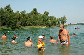 A szabadstrand végighúzódik a tó egész innenső partján. Bár hétvége lévén viszonylag sokan voltak, nem léptünk egymás szájába, és sikerült kellemes árnyékos helyet is találni.