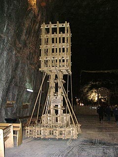 . A belépőjegy (15 RON) megvásárlása után buszra szálltunk, és azzal indultunk el a bánya mélyére. Ha jól emlékszem, akkor kb. 80 méter mélyre vitt le bennünket a busz, a menetidő kb. 6-8 perc lehetett. Amikor kiszálltunk a buszból, erős bűz csapta meg az orrunkat. A buszok és a sót szállító teherautók kipufogó gáza megül a bányában – pedig állítólag folyamatosan szellőztetnek -, és igen kellemetlen szag van.
