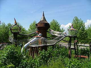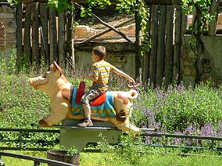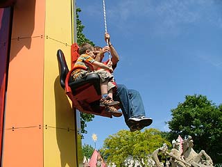 A bejáraton belépve rögtön érdekes játékok fogadják az érkezőket. Jobbra egy torony található, amelyre egy székbe beülve egy kötél segítségével lehet felhúzni magunkat (egészen kicsi erő kell hozzá, a gyerekek is könnyedén fel tudják húzni).