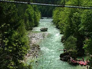 A pénztártól az út a folyó partján (a folyó nagyon gyönyörű, zöldes kék színe van, és tele van vadvízi evezősökkel) egy szűk ösvényen indul. Ez a szakasz elég nehézen járható ezért néhányan már innen vissza is fordultak.