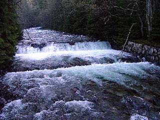 A szálloda felé vezető kanyargós utat egyre magasabb fenyőfák szegélyezték és egy gyors hegyi folyón is át kellett kelnünk, ami a szűk híd miatt busszal nem is volt olyan egyszerű.