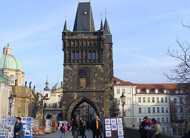 A Károly-híd egy részét éppen felújítják, de így is tele van árusokkal, mutatványosokkal és turistákkal.