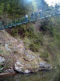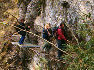 Nem tudom, érthető-e, mindenesetre mikor a tákolmány még meg is mozdult a lábam alatt, (némelyik már kicsit rozsdás), akkor én azt mondtam, hogy köszi, és visszaszaladtam a legelejére, aztán se le, se fel. Hosszas rimánkodás, és egy nyugdíjas csoport átkelésének megtekintése után aztán mégis vettem az akadályt. (Visszafelé már nem tudtam volna indulni, lefelé járva ezek az utak még „izgalmasabbak”.