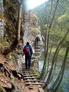 Ezután következett a Hernád-áttörés, ami a Hernádnak egy olyan szakasza, ahol a folyó egy szűk, sziklafalak közötti mederben folyik. A turistaút itt általában a folyó mellett fut, de ha ez nem lehetséges, akkor a falon megy tovább. Na, nem kell sziklát mászni sehol, mivel az ilyen gyenge idegzetű kirándulókat, mint én is, mindenütt létrák, sziklatálcák és doronglétra-hidak segítik.