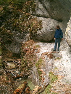 Ezután elérkeztünk a már ismert hatalmas függőhídig és útelágazásig, ahol most én is a Kolostor-szakadék nevű útvonalat választottam, mivel a férfiak eskü alatt vallották, hogy semmivel sem nehezebb, mint a Rám-szakadék (úgy látszik, ez lett a mindenkori viszonyítási alapunk). Bár a barátunk a férjemmel ellentétben mintha kevésbé lett volna meggyőző… Aztán mégis elhittem, végigjártam, és tényleg csak egyszer kiabáltam, a már említett első létra után. Ez a szakasz egyébként egyirányú, elvileg csak felfelé lehet menni, mert nehéz kitérni a keskeny utakon.