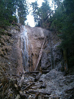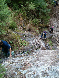 Az én rémálmom a sziklatálca elnevezésű alkotmány lett, ami leginkább olyasmi, mint egy fém lábtörlő rács, tehát teljesen átlátszik, belefúrják a sziklafalba, a kezed ügyébe még egy láncot is tesznek, aztán mehetsz… Akkor nem is vészes, ha csak 4-5 m magasan van, de volt egy rész, ahol ezek a tálcák irtó magasan vezettek, ráadásul a közepe felé egy-két tálcán behomorítva kellett átkelni, mert a sziklafal kijjebb lógott, mint alul a tálca. Lent pedig a patak zubogott…