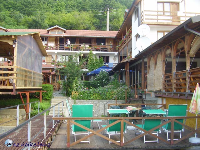 A buszról leszállva a bejárattól felfelé és lefelé is indult lépcső. Az étteremig két emeletet is le kellett menni a meredek lépcsőn. A parányi kertnek alig jutott hely, mert kialakítottak egy napozóteraszt. Az étterem levegős, már a víz fölé épült. A napozóteraszról lehet kisétálni a pontonra, innen indulnak a csónakok a Kazán-szorosba, illetve innen lehet létrán leereszkedni a vízbe úszni. A hosszú út után azonnal vacsorázni tereltek bennünket. Utána kipróbáltuk a vizet. Nemcsak a levegő volt meleg és simogató, de a víz is. A fürdéstől felfrissülve még hosszasan beszélgettünk és énekeltünk, ehhez kellő munícióval az étterem bor-automatája szolgált: ha bedobtunk két lejt, egy deci vörösbort csurgatott az alá tartott pohárba!