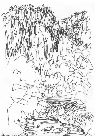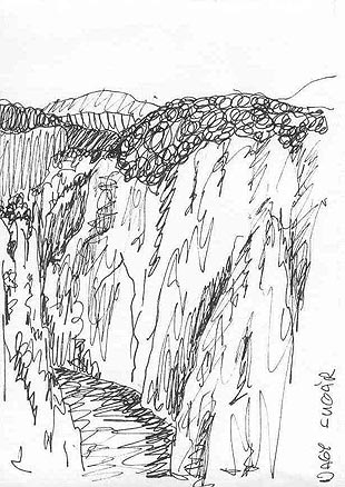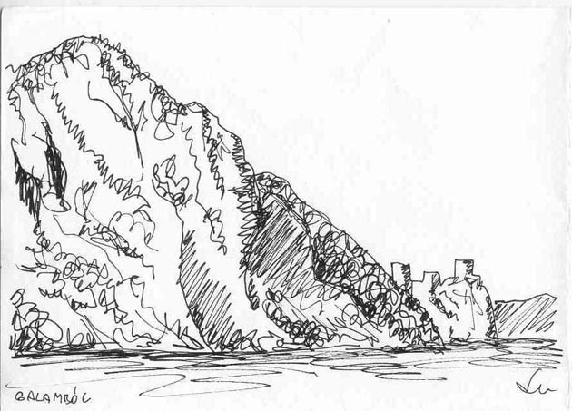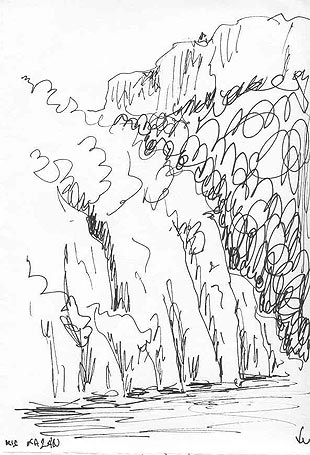 A fehér sziklák között a mélyben ráláttunk a Nagy-Kazánra | Készül a rajz a Nagy-Kazánról |