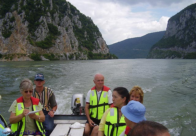 Az első nap a Kis és Nagy-Kazán szorosok bejárása volt csónakkal. Mivel a csónakba nem fértünk be sokan, több fordulót tettek meg. Addig a többiek fürödtek, napoztak. Két csónak állt rendelkezésünkre: egy elegáns, gyors motorcsónak, és egy motoros bádogladik. Szerencsére, mi ebben kaptunk helyet. Mentőmellényeket kellett felvenni, ez különösen látványossá tett bennünket. Először átszeltük a sima víztükröt és megközelítettük a szerb partot, hogy közelről láthassuk Trajanus tábláját. Ő készített itt utat az ókorban. A vízszint megemelkedésével 40 méterrel magasabbra kellett áthelyezni a táblát. Az orsovai öbölnél a Duna nagyon széles, csak keskeny rés jelzi a hegyek között, honnan érkezik a folyó. Ez a Kis-Kazán-szoros bejárata. Közeledve a réshez, egyre lélegzetelállítóbb volt a táj. A fehér mészkőfalak meredeken zuhannak be a vízbe. Állítólag itt 90 méter mély a víz, szélessége 120 m.