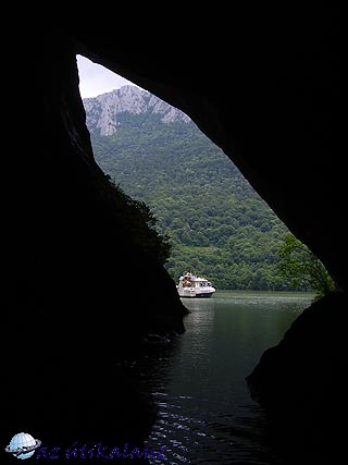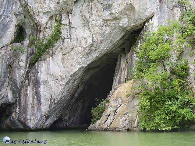 A visszaduzzasztás nagyon lelassította a folyót. Nehéz elképzelni a korábbi állapotot, amikor a szűk helyen rohant, örvénylett a folyó. Állítólag ezért is kapta nevét két szoros, mert a víz ?forrt? benne. A kisebbik Kazán után újra tóvá szélesedik a Duna. Ez a Dunatölgyesi (dubovoi) medence. A román parton hatalmas üdülőépítkezés folyik. Hamarosan beérünk a Nagy-Kazán-szorosba. Ez még szűkebb, mint a kicsi. A sziklafalak is magasabbak. A parton a meredek sziklák között barlang szája tűnik fel. Fiatal vezetőnk levette a sebességet és bekormányozta a barlangba a csónakot. Óvatosan elmerészkedtünk addig, míg csak lehetett. Kintről beszűrődött a világosság, jól láttuk, hogy mekkora barlangba kerültünk. Ez a Veteráni barlang. Szárazföldi bejárata a hegyeken túl van, barlangász felszereléssel bejárható.